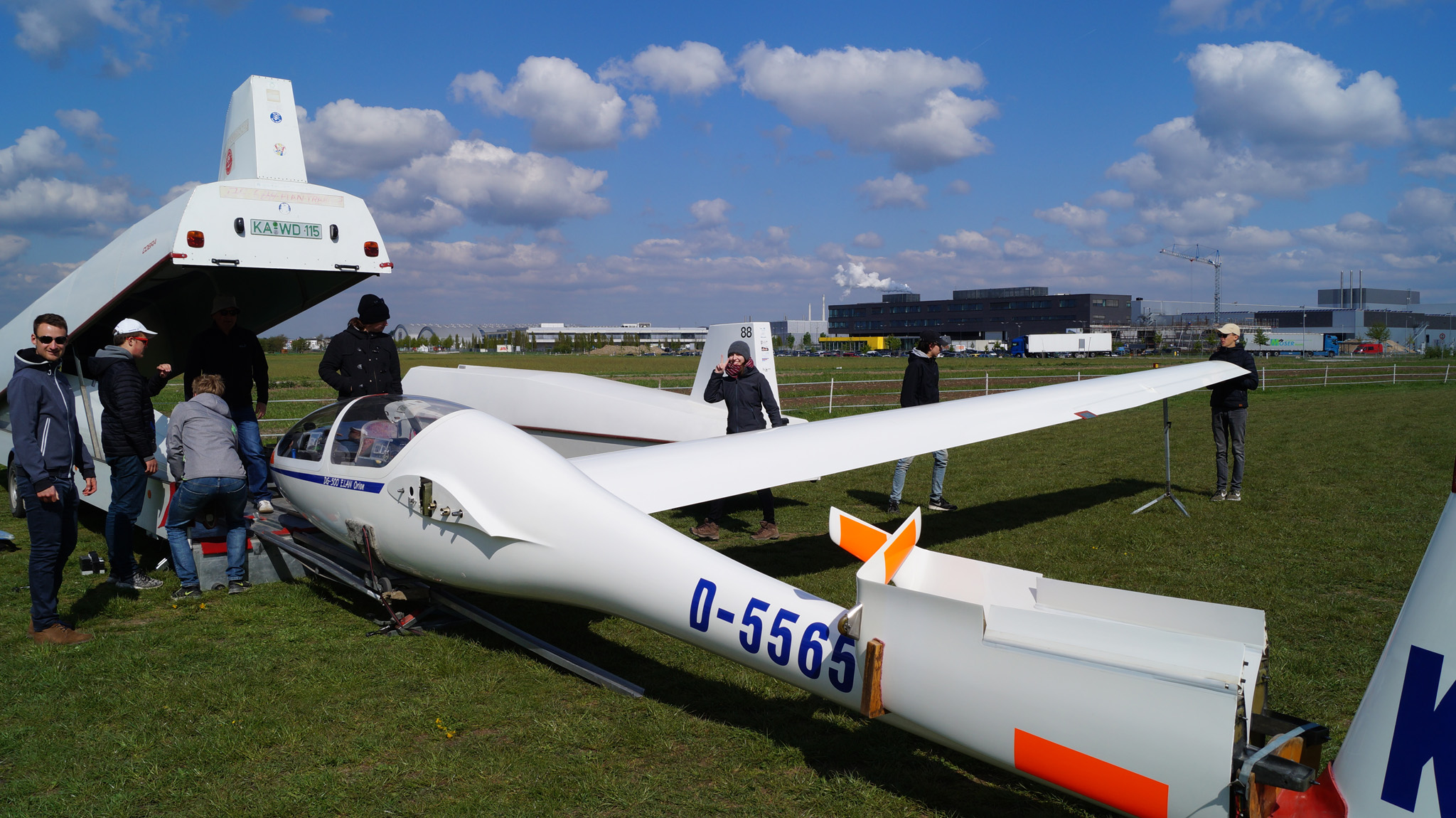 ![]() Beim Aufrüsten der Segelflieger helfen Alle mit |