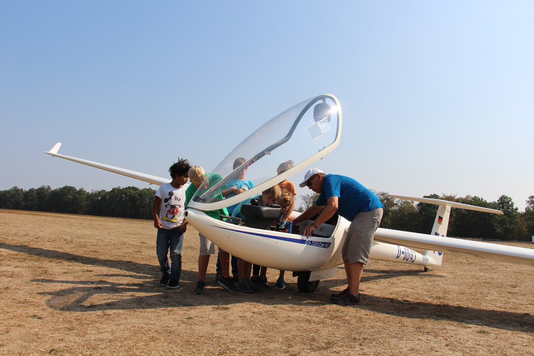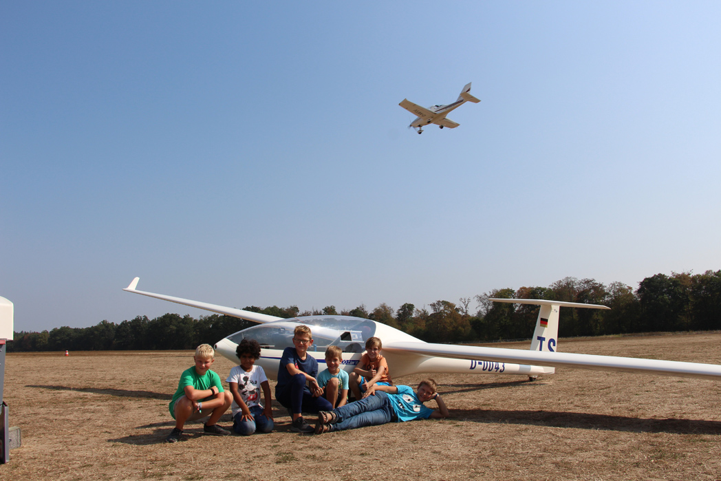 Am 5. September machten sich sechs Kinder und zwei Betreuerinnen des städtischen Schülerhortes Weinbrennerstraße im Rahmen eines Ferienprogrammes mit den Fahrrädern auf zum Segelflugplatz in Rheinstetten. Dort wurden sie von Rolf-Dieter Macha und Severine Lehnhardt, beide Segelflieger des FSV, empfangen. Severine und Rolf führten sie nach einer kurzen Verschnaufpause durch die Flugzeughalle, zeigten den begeisterten Kindern die Flugzeuge und beantworteten alle Fragen zu den Fliegern. So sahen die Kinder zum Beispiel einen Doppeldecker, einen Motorsegler und mehrere Ultraleicht-Flugzeuge. Nebenbei erklärten beide alle Instrumente und Steuereinheiten, die man zum Fliegen braucht.
