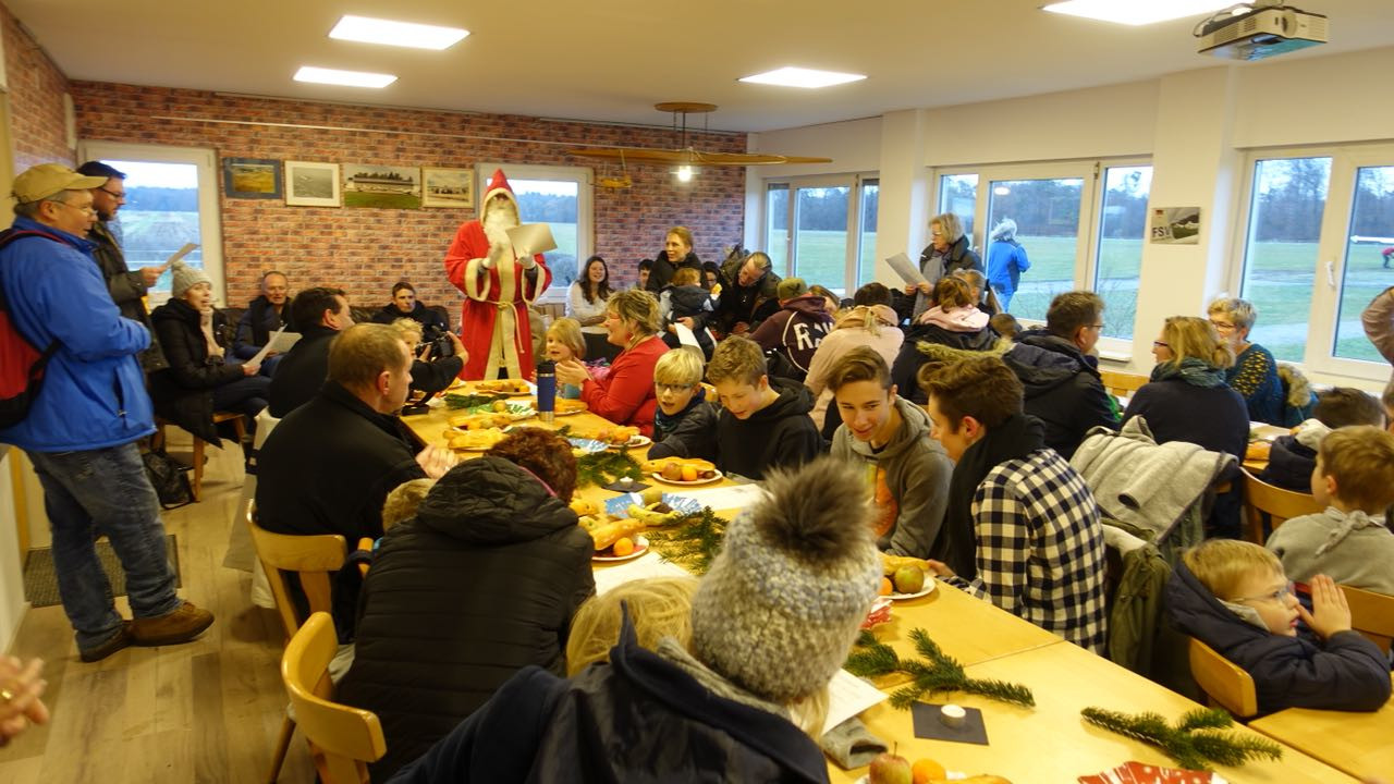 Zunächst wurden die Geschenke die er mitbrachte, in einer Feier mit Liedern und Gedichten überreicht. Danach konnten sich die Kinder über Dambedei, Obst, Kakao und Weihnachtsgebäck freuen. Das Vereinsheim war von der Fliegerjugend und Senioren-Mitgliedern weihnachtlich dekoriert.