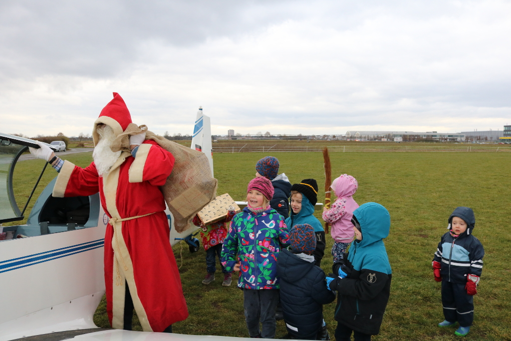 Fast 30 Kinder haben den Nikolaus winkend empfangen. Zuerst drehte er ein paar Runden über den Flugplatz und winkte den Kindern zu. Nach der Landung packte er Säcke voller Geschenke aus. Die Rute hatte er zwar auch dabei, musste aber davon kein Gebrauch machen.