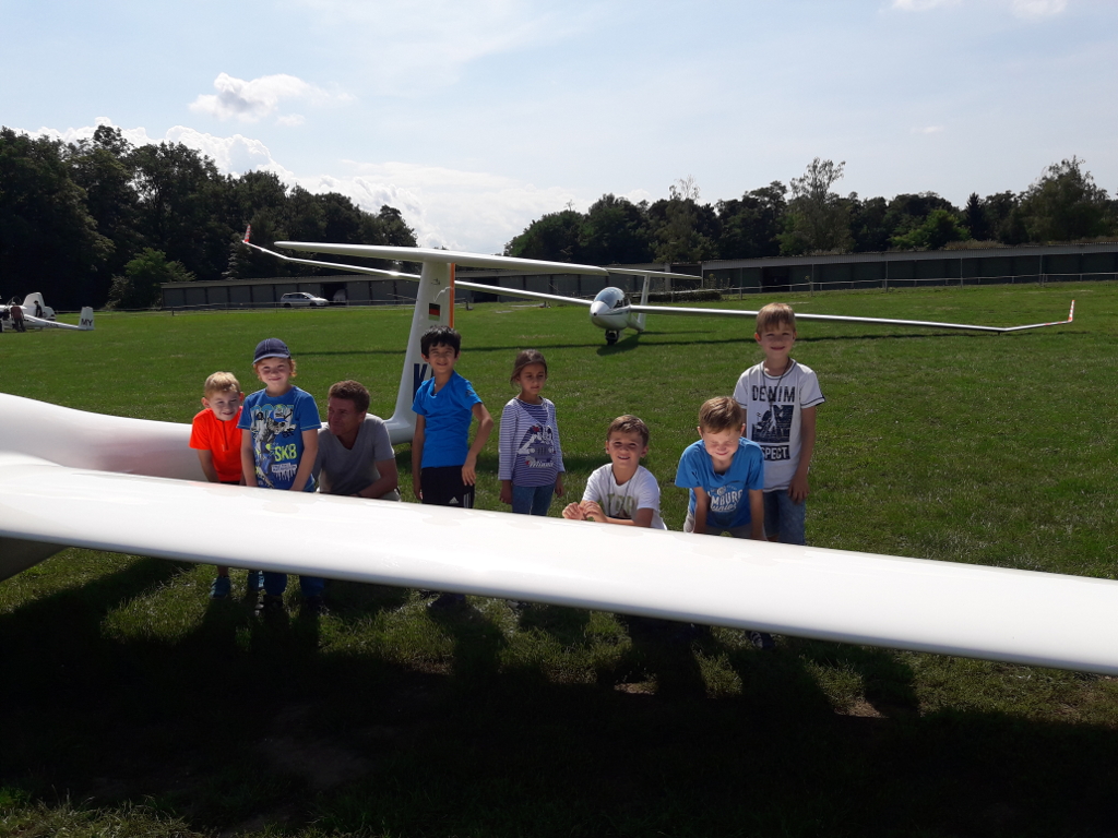 Am 16. August 2017 machten sich 8 Kinder und 3 Betreuer des Schülerhortes Weinbrennerstraße im Rahmen eines Ferienprogrammes mit den Fahrrädern auf zum Segelflugplatz in Rheinstetten. Dort wurden sie von Rolf-Dieter Macha, einem Segelflieger des FSV, empfangen. Rolf führte sie nach einer kurzen Verschnaufpause durch die Flugzeughalle, zeigte den begeisterten Kindern die Flugzeuge und beantwortete alle Fragen zu den Fliegern. So sahen die Kinder zum Beispiel einen Doppeldecker und einen Motorsegler. Nebenbei erklärte Rolf alle Instrumente und Steuereinheiten, die man zum Fliegen braucht.