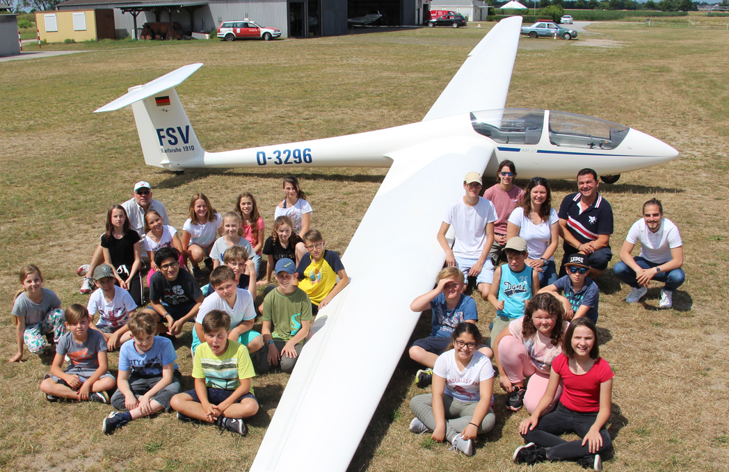 Am 5. September machten sich sechs Kinder und zwei Betreuerinnen des städtischen Schülerhortes Weinbrennerstraße im Rahmen eines Ferienprogrammes mit den Fahrrädern auf zum Segelflugplatz in Rheinstetten. Dort wurden sie von Rolf-Dieter Macha und Severine Lehnhardt, beide Segelflieger des FSV, empfangen. Severine und Rolf führten sie nach einer kurzen Verschnaufpause durch die Flugzeughalle, zeigten den begeisterten Kindern die Flugzeuge und beantworteten alle Fragen zu den Fliegern. So sahen die Kinder zum Beispiel einen Doppeldecker, einen Motorsegler und mehrere Ultraleicht-Flugzeuge. Nebenbei erklärten beide alle Instrumente und Steuereinheiten, die man zum Fliegen braucht.